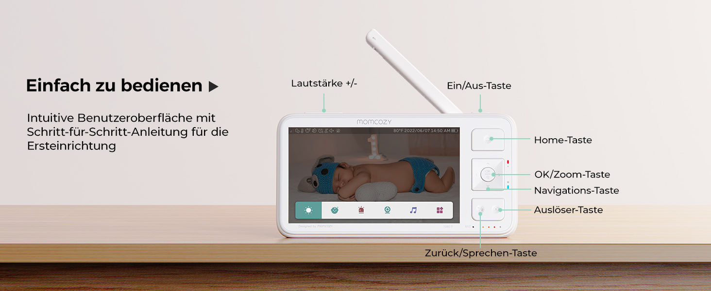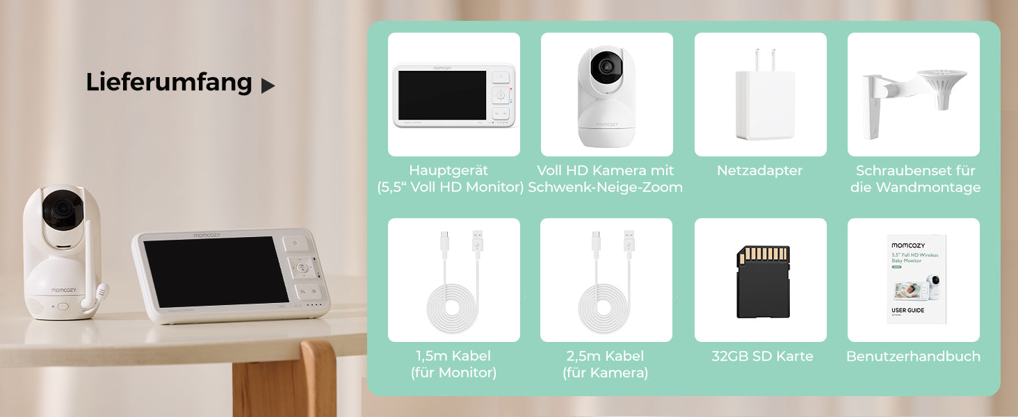 Das neue Momcozy Video Babyphone (BM03) wurde für Erstgebärende und vielbeschäftigte Eltern entwickelt und steht für "Smart Parenting". Das 5,5 inch große, 1080P hochauflösende Display bietet eine kristallklare Sicht auf Ihr Baby in jedem Moment, während der große 5800mAh Akku Tag und Nacht durchhält. Das starke Signal hat eine beeindruckende Reichweite von 1640 Metern und kann von 2 Wänden nicht gestoppt werden, so dass Sie auch in der Küche oder im Wohnzimmer nach Ihrem Kleinen sehen können. Darüber hinaus kann unser Videobabyphone Bewegungen des Babys erkennen, einminütige Videos aufnehmen und diese auf der mitgelieferten SD-Speicherkarte zur späteren Wiedergabe speichern. Sie können auch ein Foto mit einem Tastendruck aufnehmen. So verpassen Sie keine besonderen Momente Ihres Babys mehr.